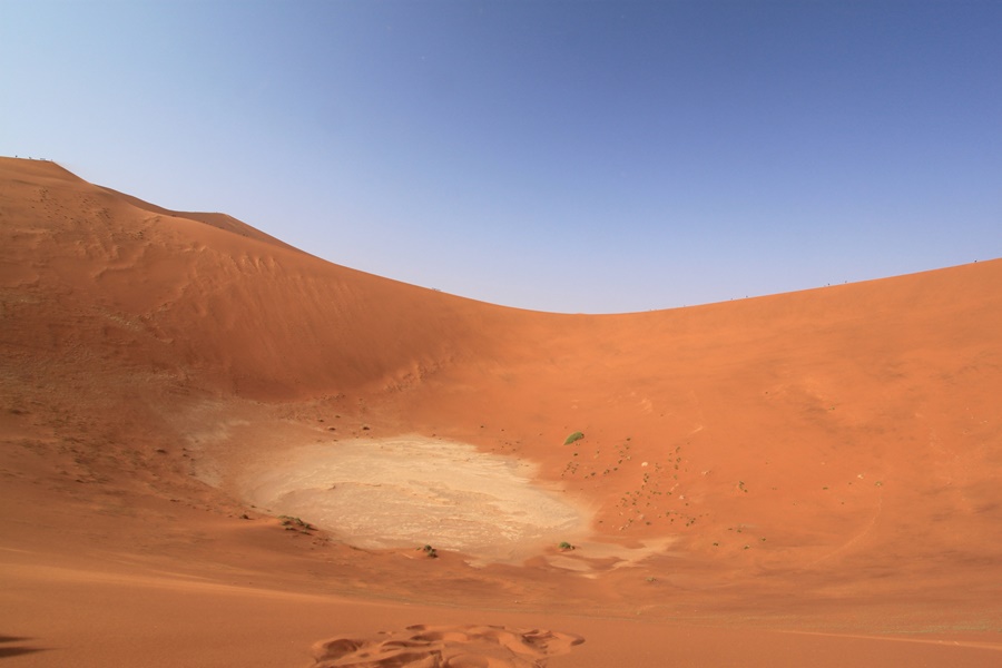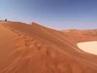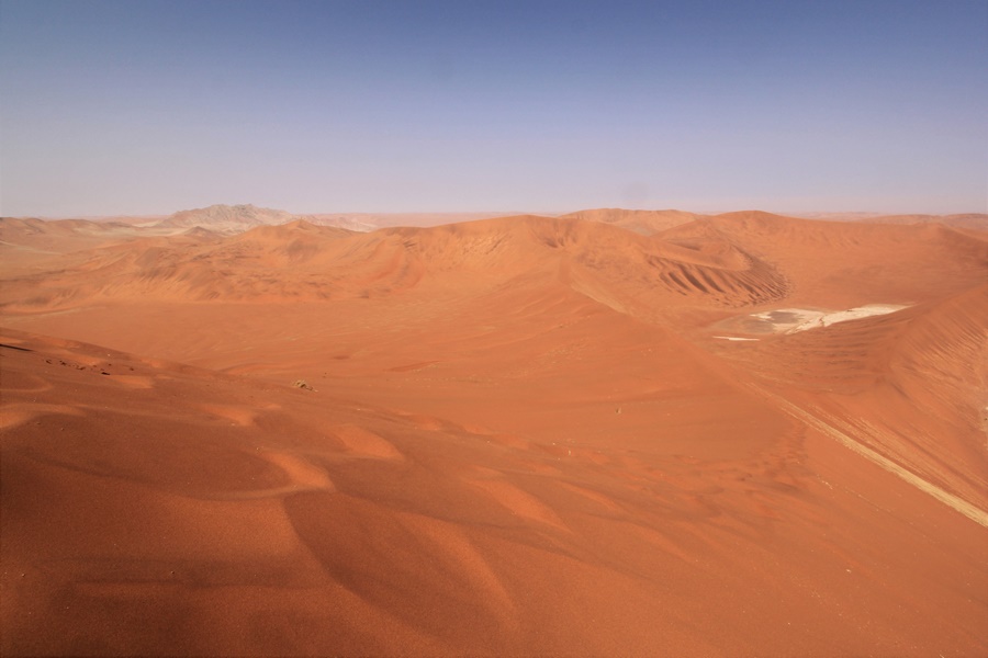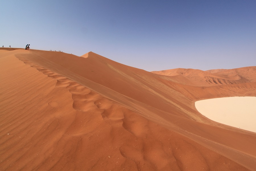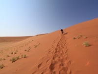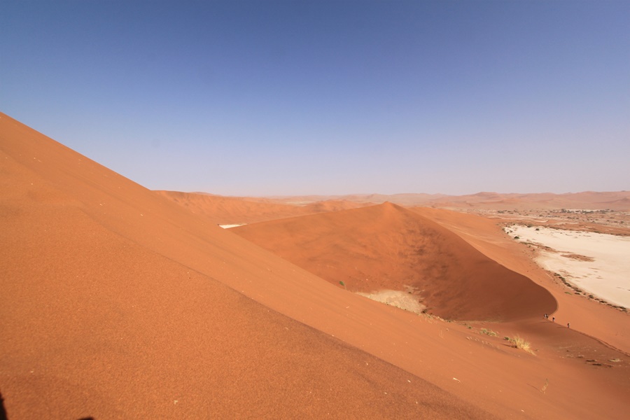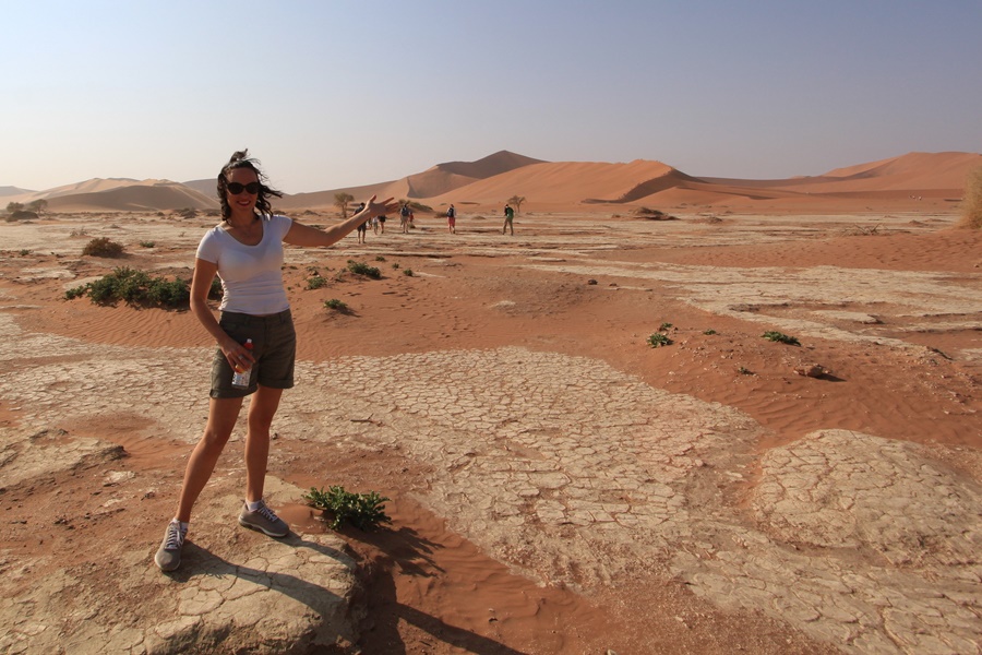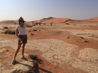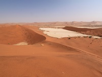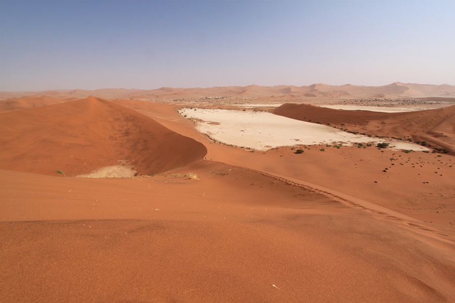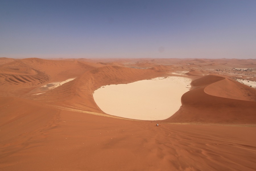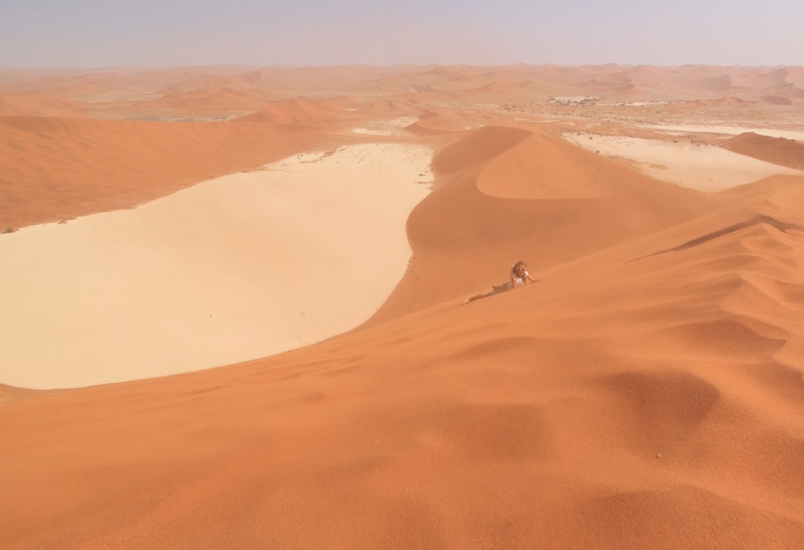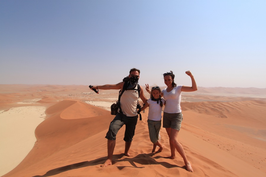 Der Übersichtlichkeit halber hat man die Dünen im Gebiet des Parks nummeriert. Einige Dünen im Gebiet des Sossusvleis sind besonders bekannt. Die bekannteste unter ihnen ist sicher die von den Einheimischen „Big Daddy“ oder „Crazy Dune“ genannte Düne. Mit rund 350 Metern Höhe soll „Big Daddy“ die höchste Düne der Welt sein. Zum Vergleich: Der Eiffelturm hat eine Höhe mit Antenne von 324 Meter. Ein Aufstieg kann gerade bei extremer Hitze zu einer ziemlichen Anstrengung werden. Oben werden die Dünenbesteiger mit einer wundervollen Aussicht über die umliegende Gegend belohnt. Hier unser "Gipfelfoto"